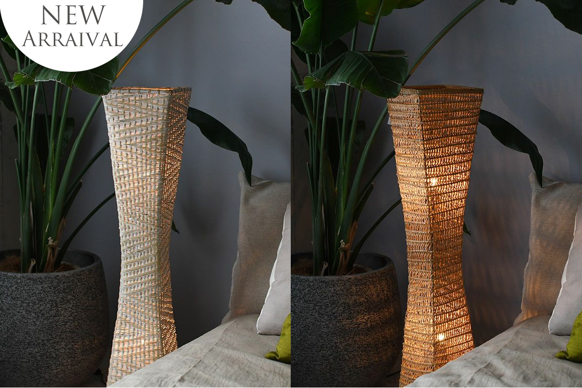 編み込んだラタンのデザインが魅力的なオリジナリティのあるフロアランプ。