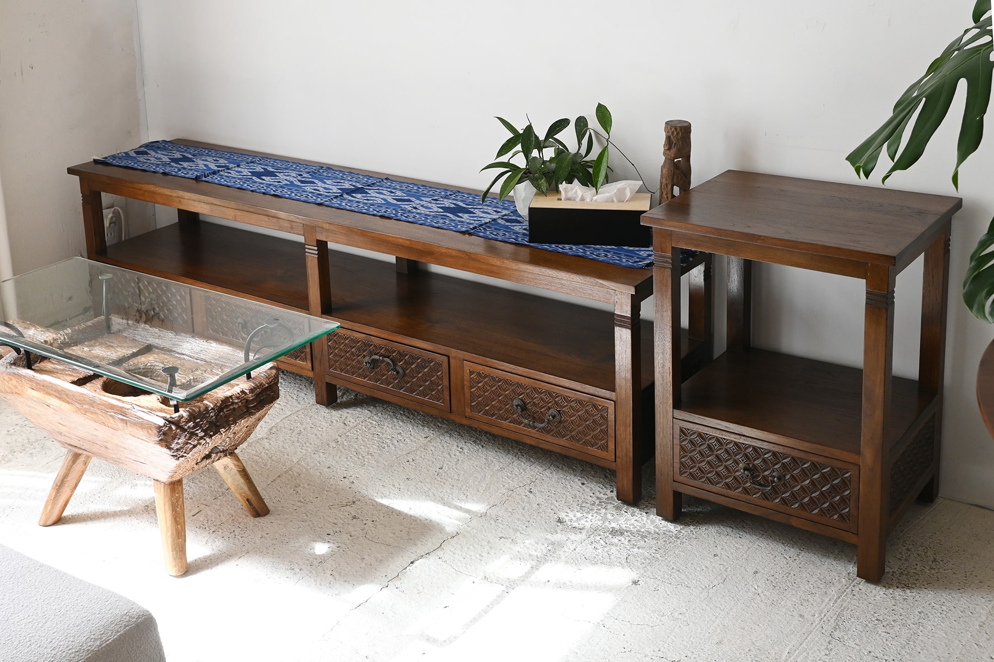 KAJA創立以来、人気を誇るチークの古材を活かした1点もののガラステーブルは、無骨な風合いを残したチーク材の古木をそのまま土台にした、古木の質感がダイレクトに伝わるこだわりの1点ものガラステーブルです。長い年月を経た古木...