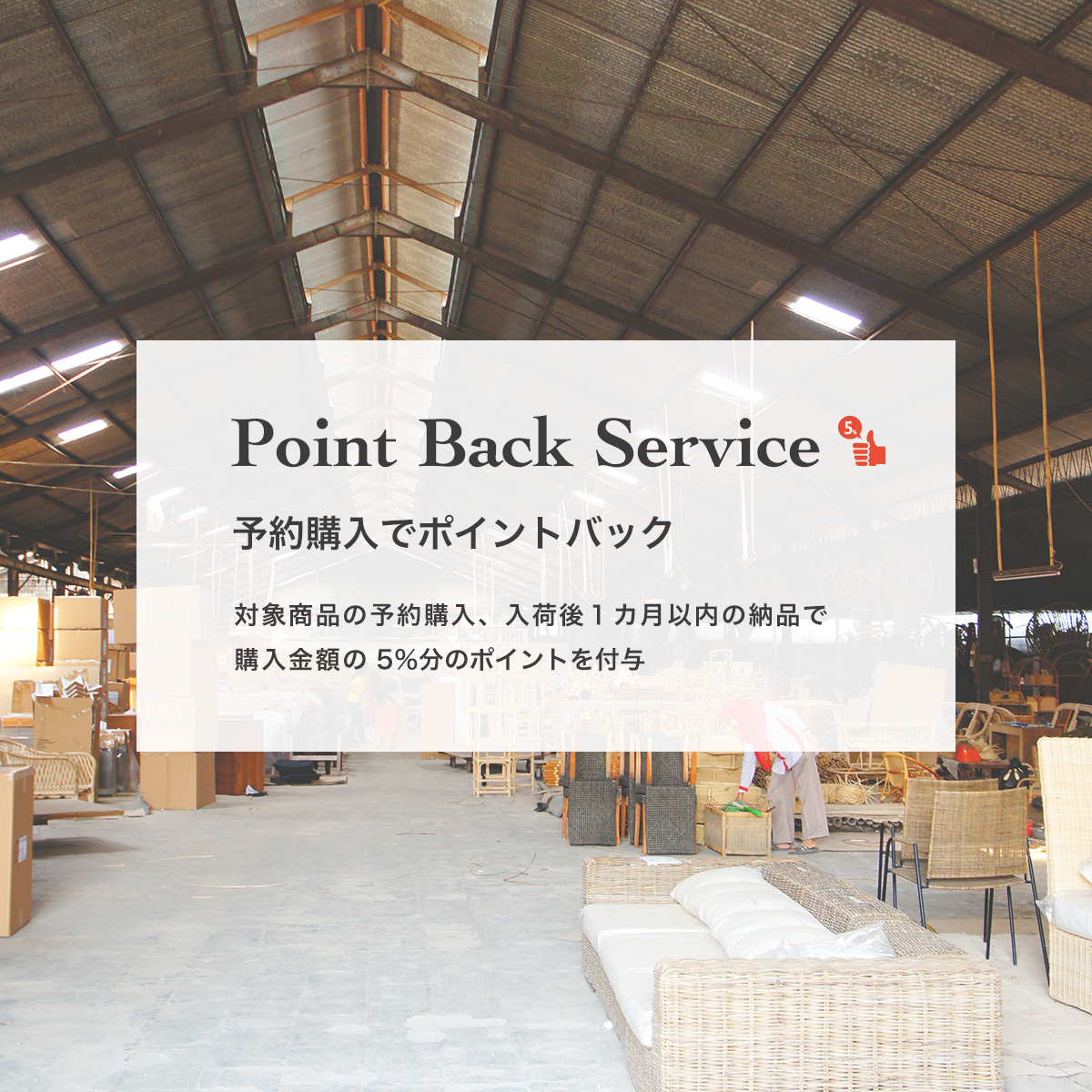 この度KAJAにて新しいポイントバックサービスを始めることとなりました。対象商品を予約購入いただき、入荷後1カ月以内に納品完了された場合、購入金額の5%分のポイントを付与いたします。お買い物時に使えるポイントなので実質5%OFFとなるお得なサービスです。
