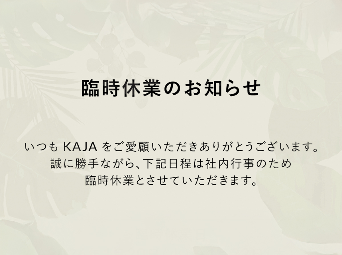 平素より KAJA をご愛顧いただき、誠にありがとうございます。 誠に勝手ながら、下記日程は社内行事のため臨時休業とさせていただきます。 ■ KAJA 本店 / KAJA Online Sho...