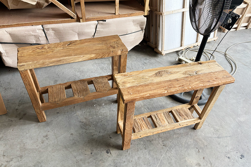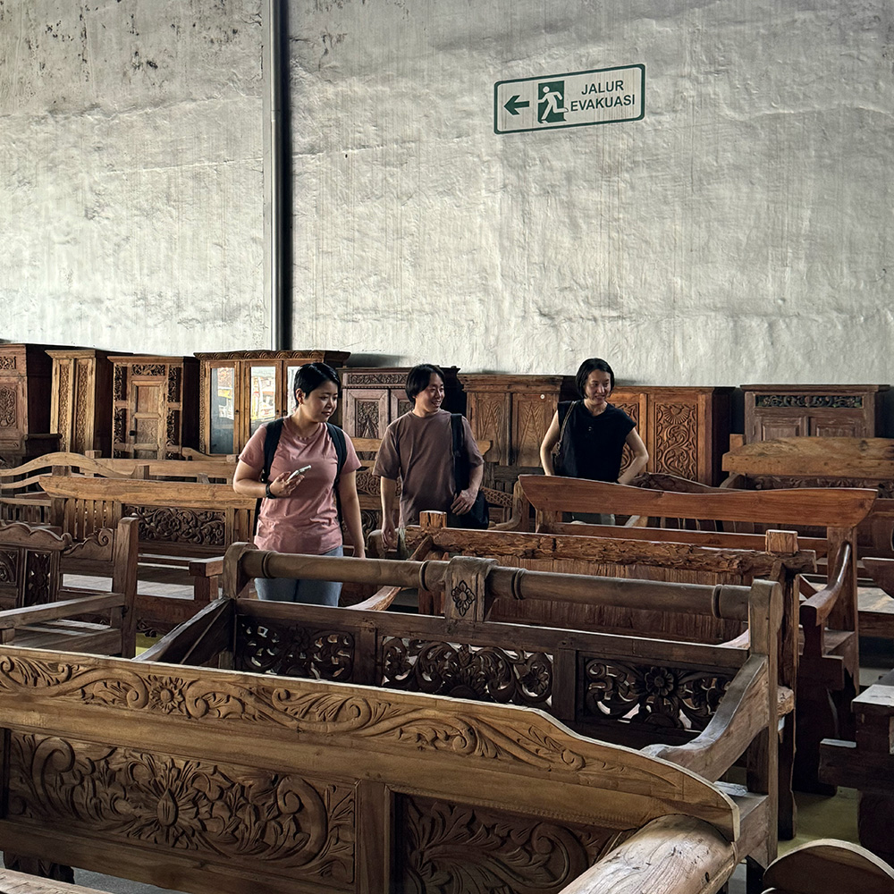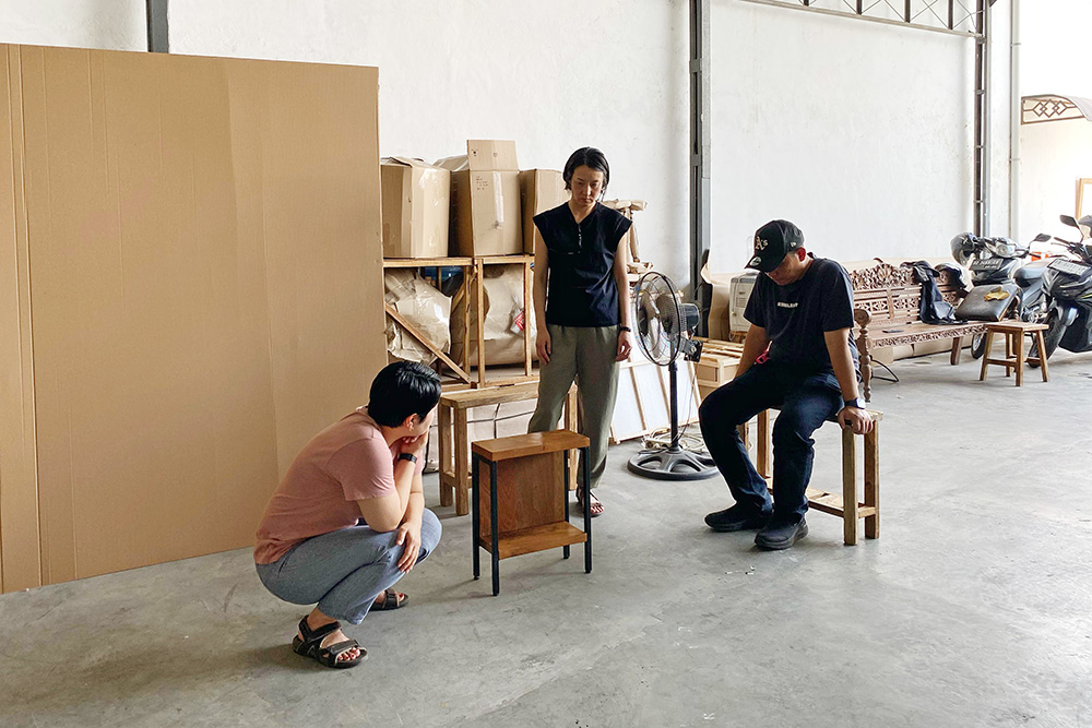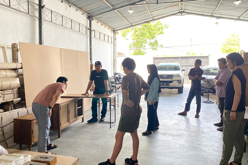 展示会に合わせてインドネシアに向かったバイヤーチームですが、ジャワ島内のKAJA事務所・倉庫でも仕事が待っています。この機会に合わせて仕上げるように、いくつか製作依頼をかけていた家具の検品です。
