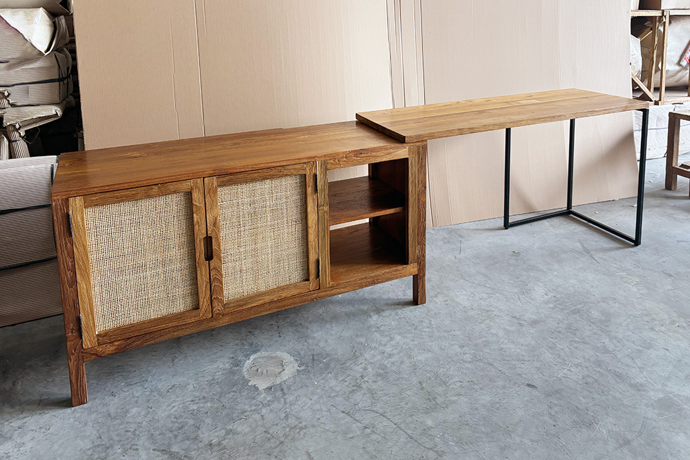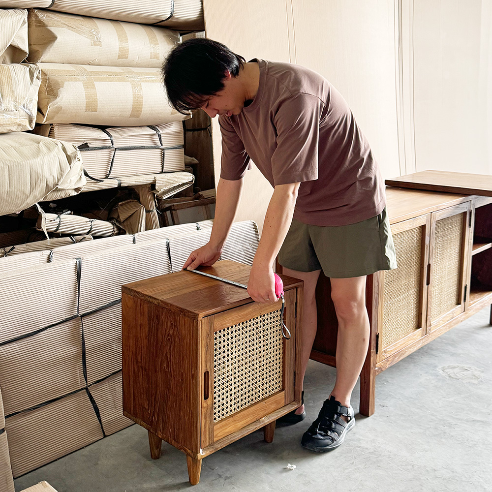 ここ最近、ラタンを扉に使ったキャビネットに人気があり、この工房でも似たキャビネットを製作していました。KAJAではカゴメ編みのラタンを扉の一部に使用していますが、ここではランチョンマットによく使用する目積編みのラタンを使用していました。このデザイン自体はインドネシアの他のメーカーでもよく見るので、珍しいということはないのですが、目積編みラタンは他では見ないタイプです。