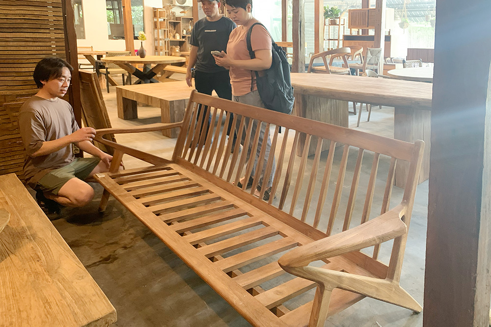 デザインは良いものの、そのままのサイズだと日本の一般住宅には大きすぎるウッドソファを発見。こちらはそのまま買い付けるのではなく、新たにリサイズして製作してもらうことにしました。