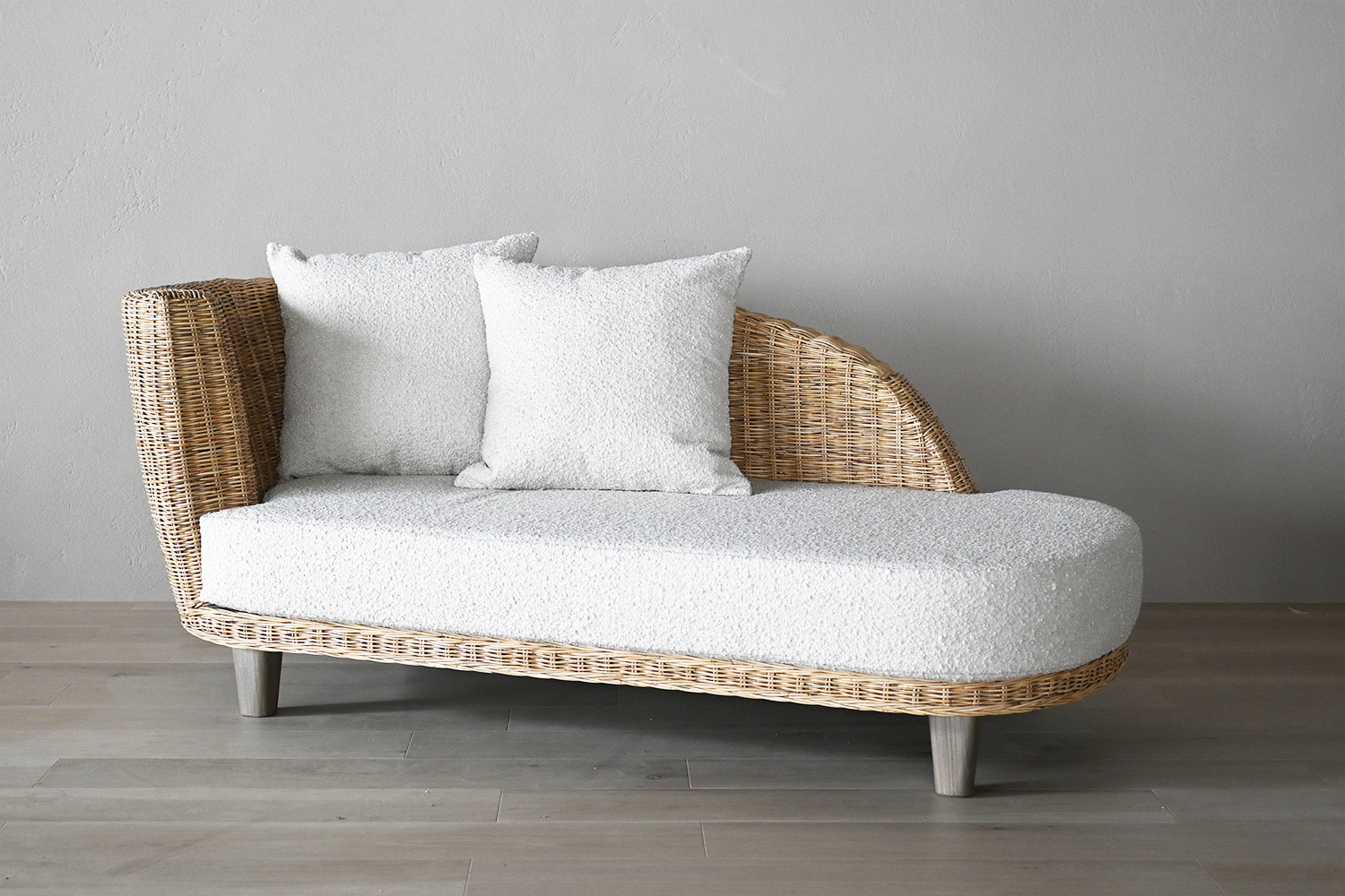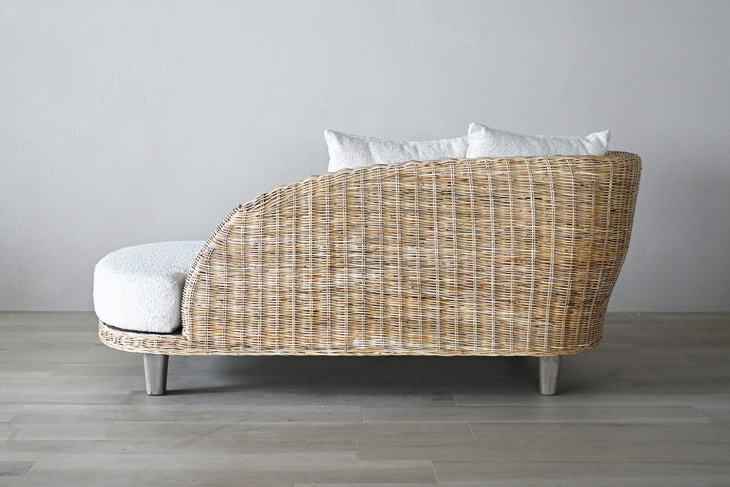ラタン素材のナチュラルな雰囲気を存分に活かしたリゾートライクなマーメイドソファ。背もたれの柔らかなラインが特徴的なデザインです。優しい雰囲気がお部屋全体に広がりリラックスした時間を過ごせます。シートと同じファブリックの2つのクッションが付属します。
