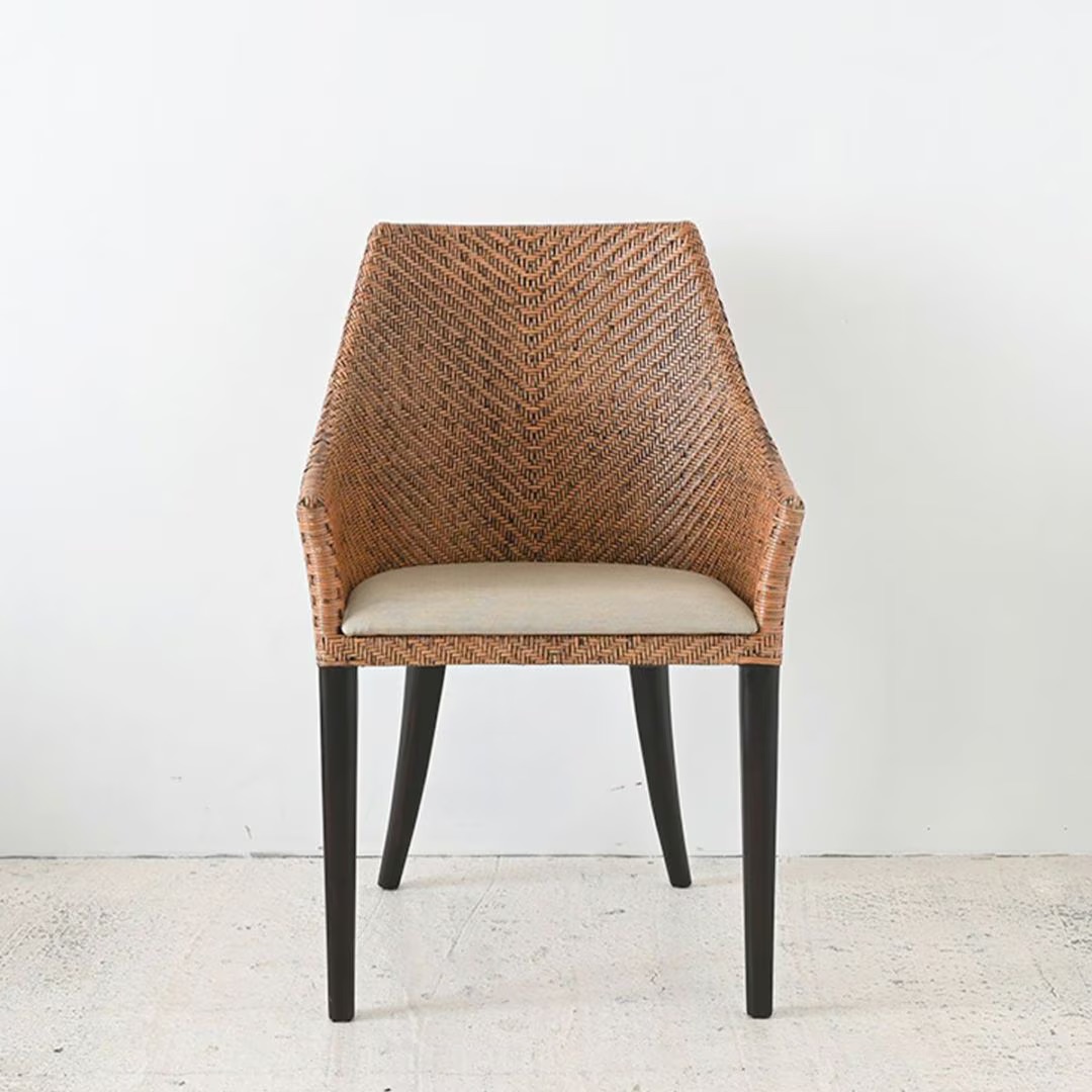 ラタン素材がナチュラルなインテリアにマッチするアーム付きのチェアです。フラットな家具にはない、ナチュラルな編みの表情がインテリアに奥行きを持たせます。