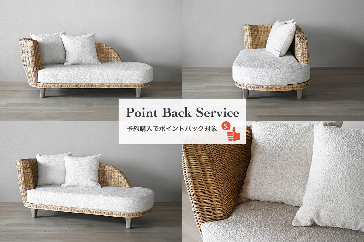 ラタン素材のナチュラルな雰囲気を存分に活かしたリゾートライクなマーメイドソファが新登場。背もたれの柔らかなラインが特徴的なデザインです。優しい雰囲気がお部屋全体に広がりリラックスした時間を過ごせます。今ならご予約購入にてポイントバックがあります。