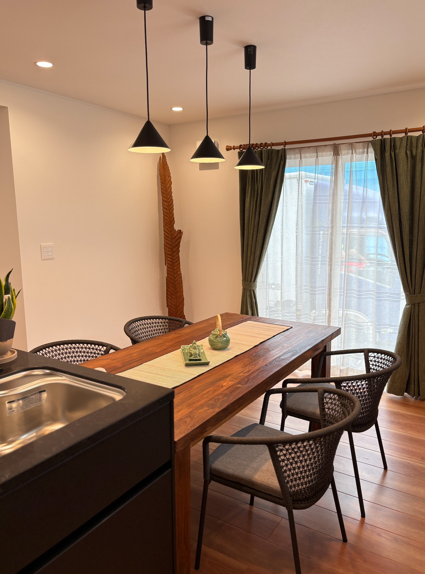 今回は完全オーダーのキッチンボードやカーテンなどを含む、リビングダイニングのトータルコーディネートをさせていただきました。