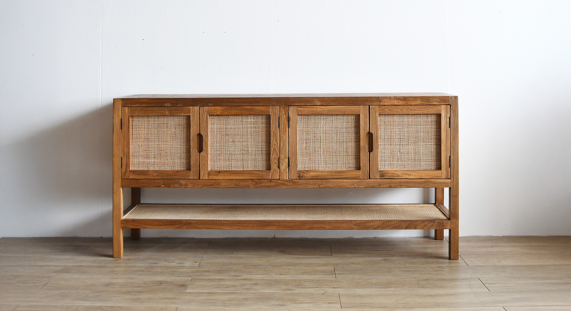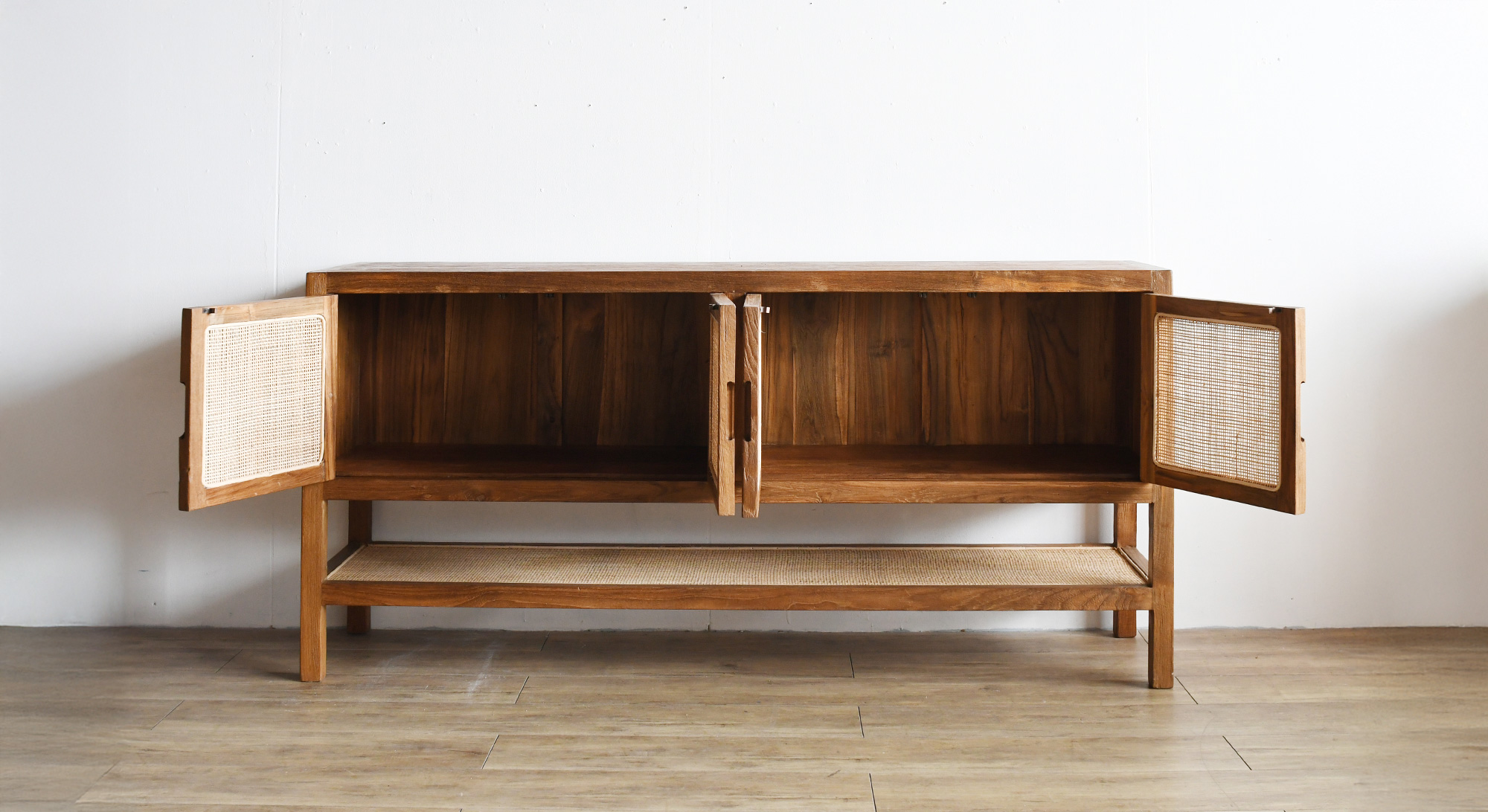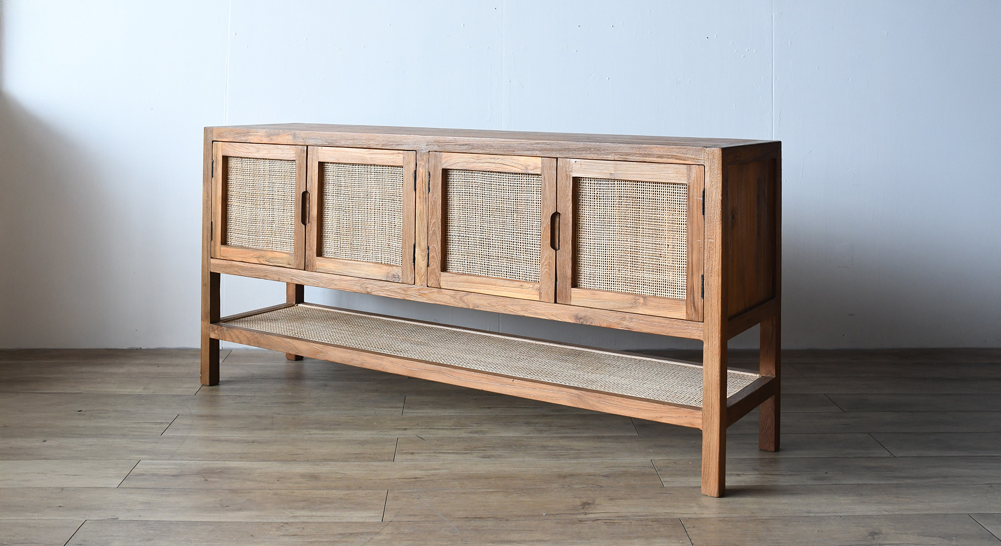 自然素材を活かしたデザインが特徴的なローボード。職人の丁寧な仕事によって生まれる細かく編みこまれたラタンの扉が、ナチュラルで華やかなアクセントに。