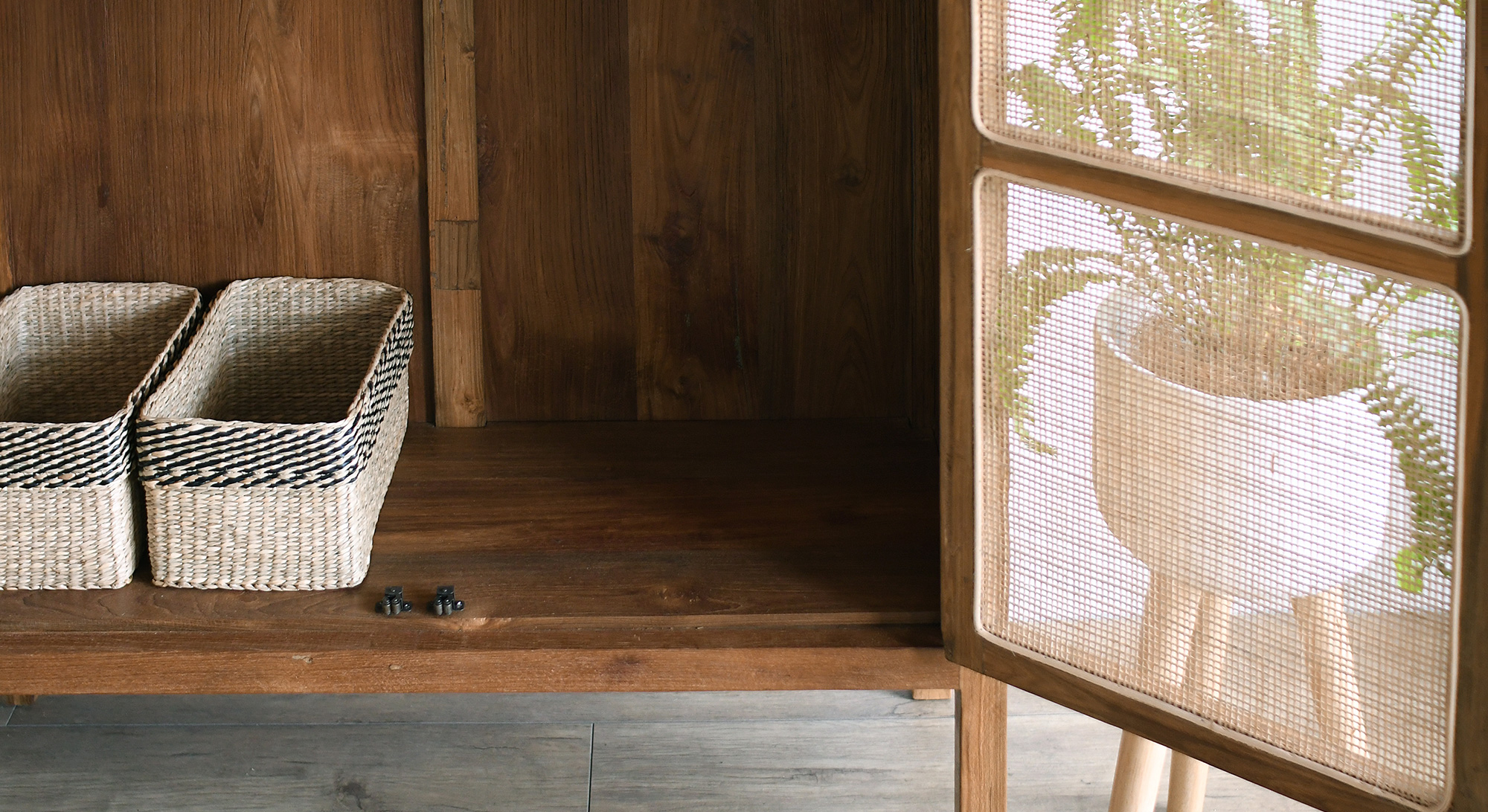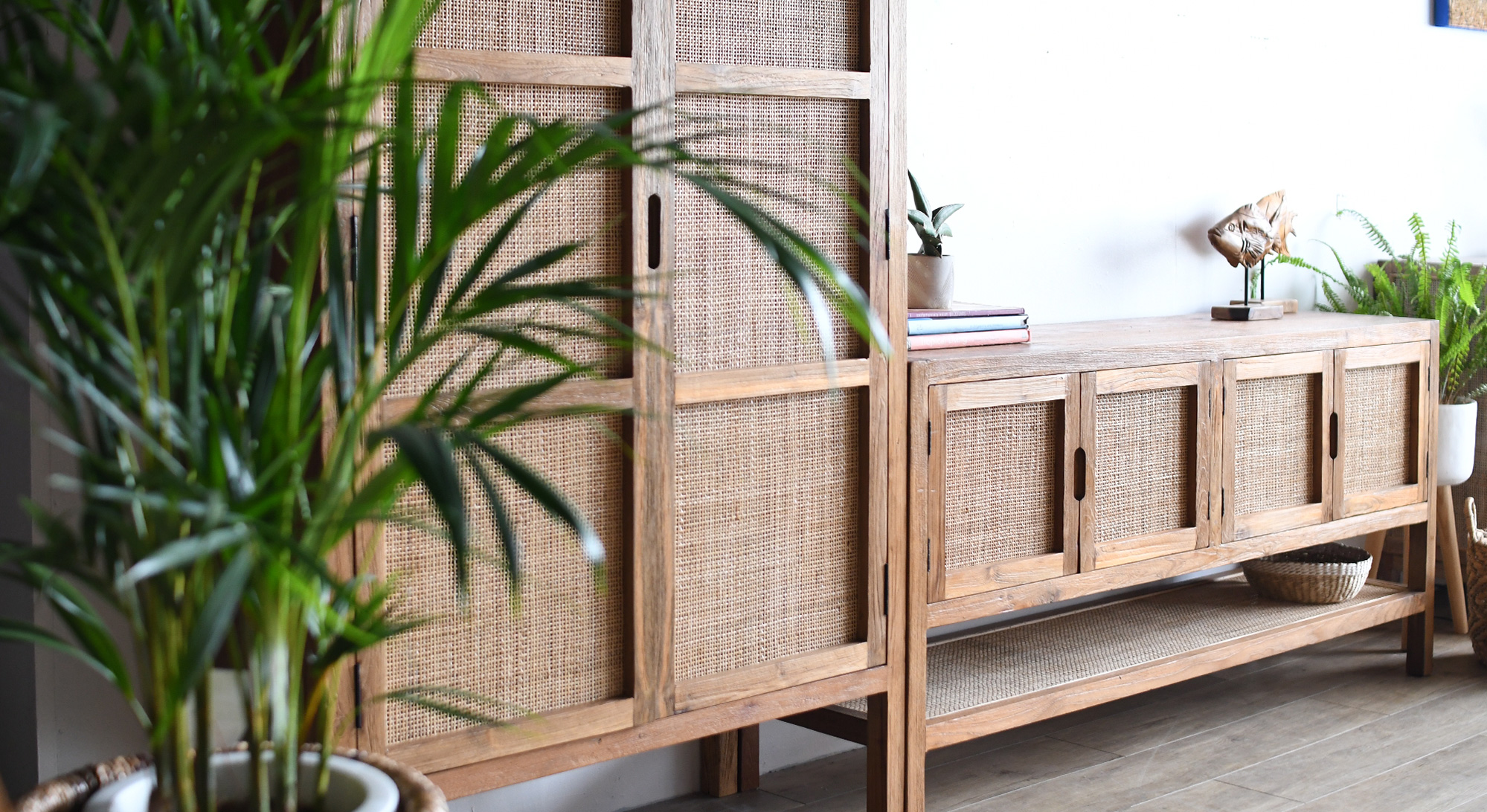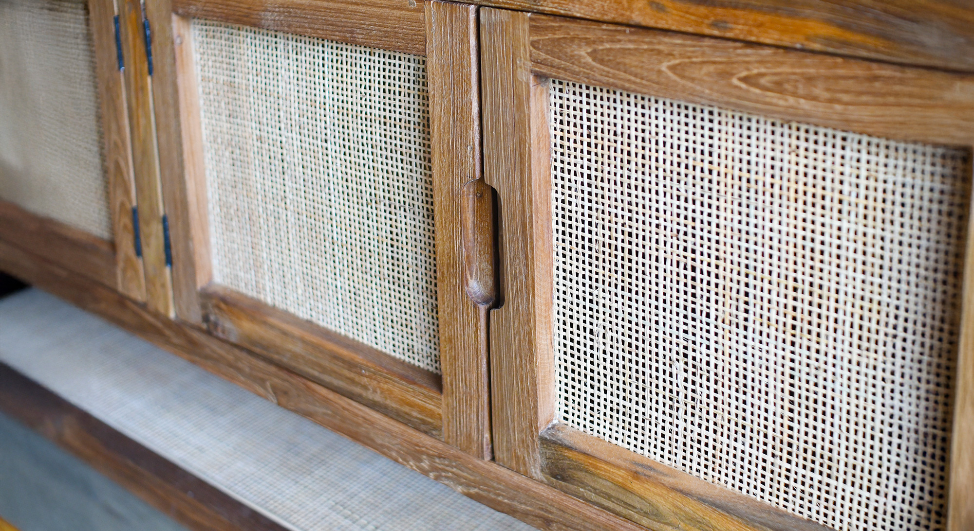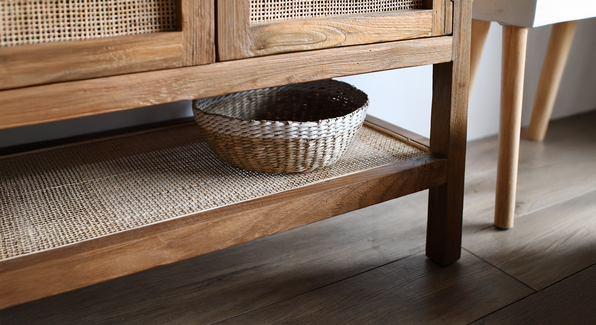 自然素材を活かしたデザインが特徴的なローボード。職人の丁寧な仕事によって生まれる細かく編みこまれたラタンの扉が、ナチュラルで華やかなアクセントに。