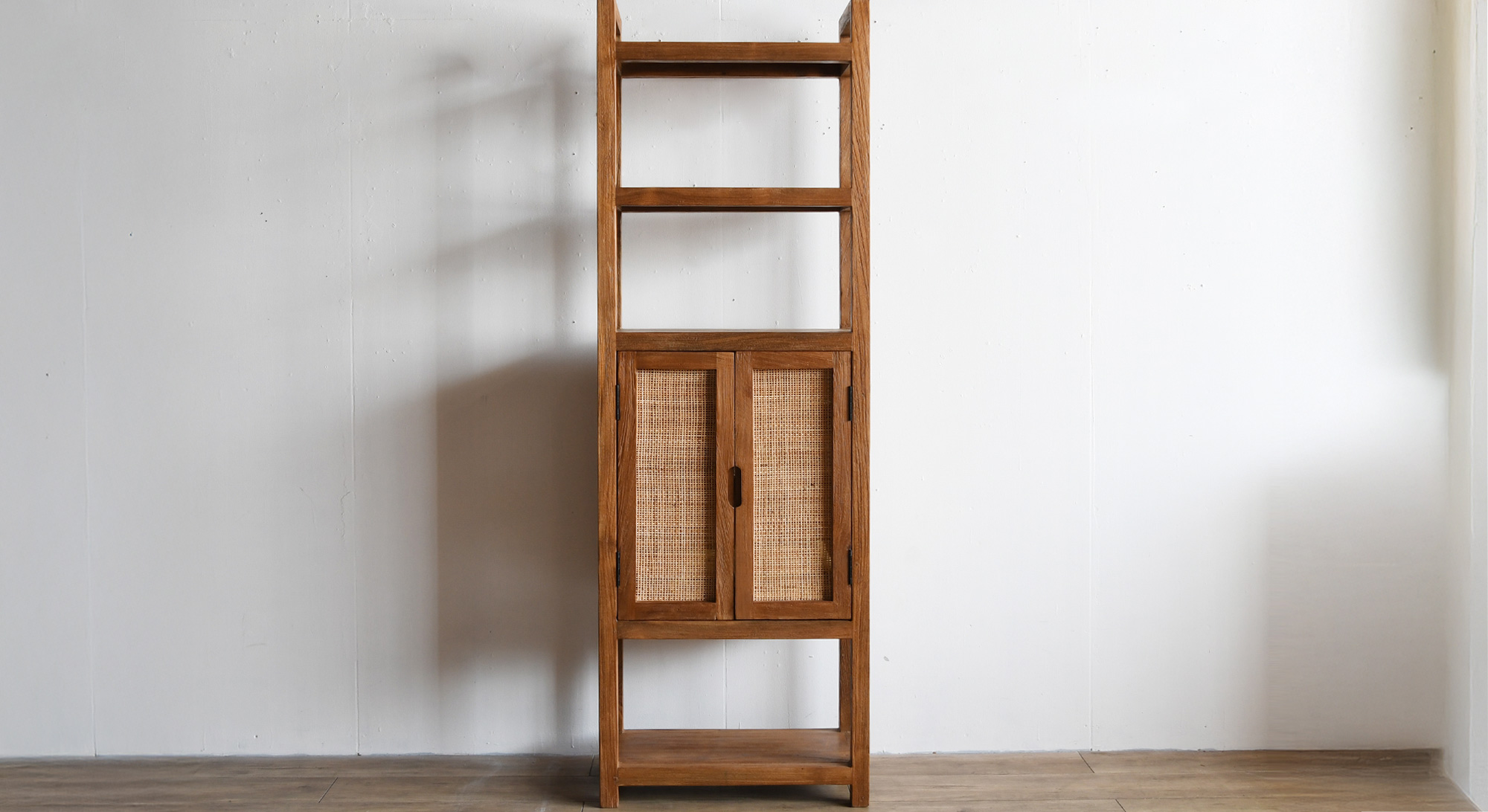 上部はラタンをあしらった扉収納。下部のオープンスペースは、本や雑貨を飾ったり、収納ボックスを加えて収納力をアップしたりとアレンジが楽しめます。