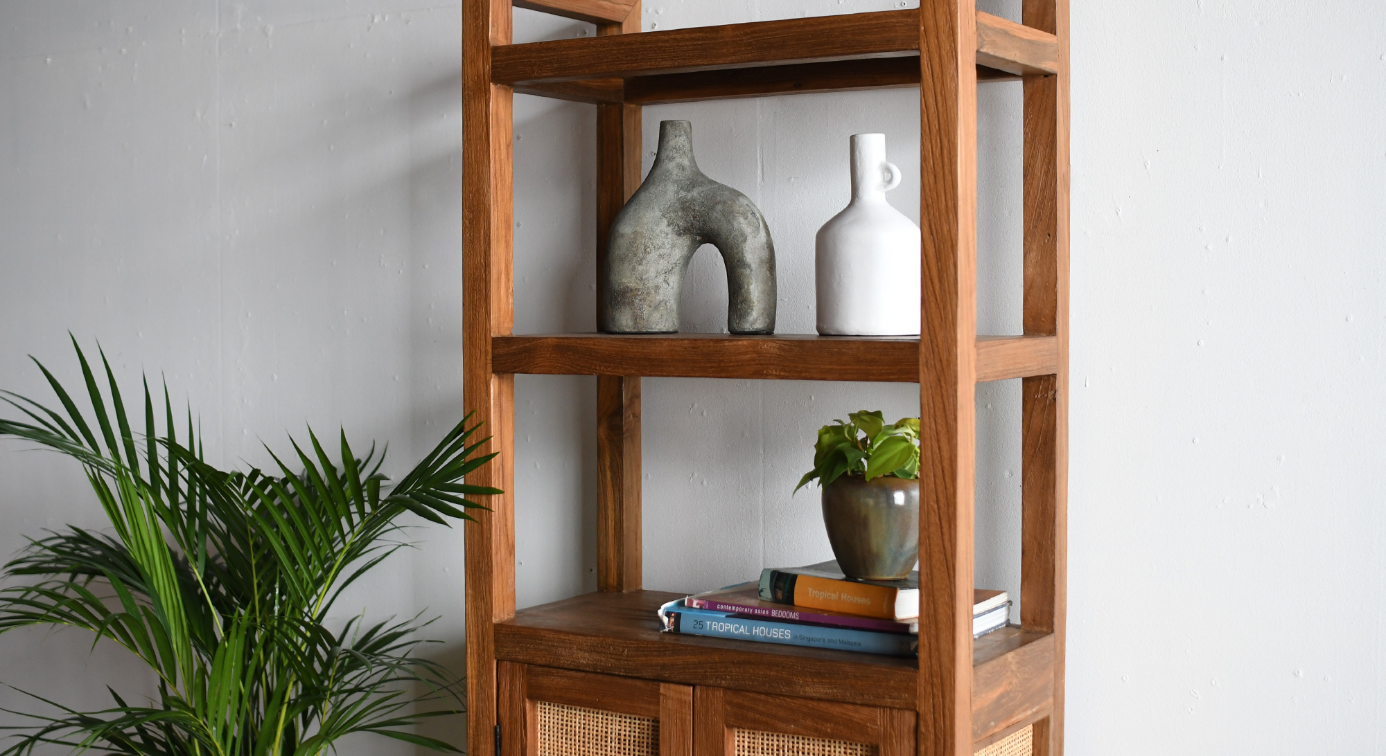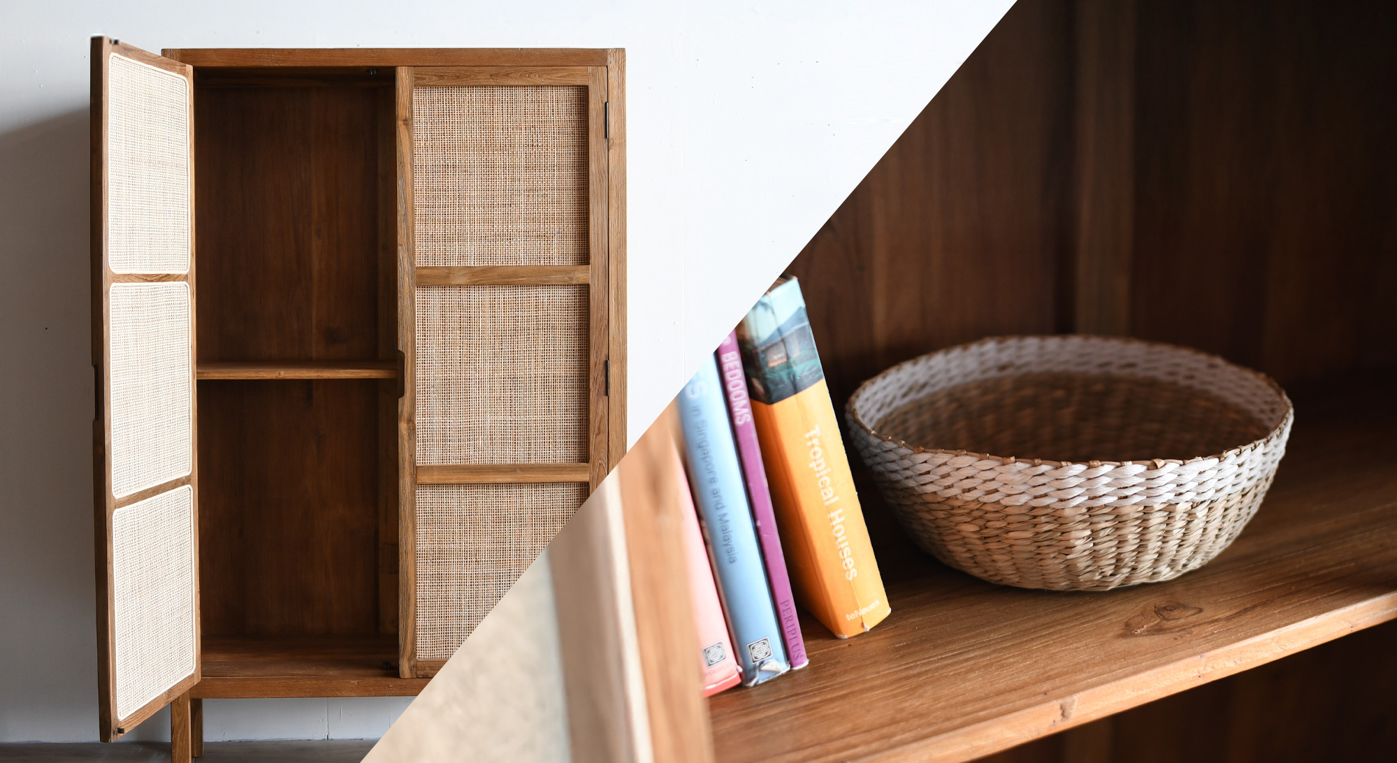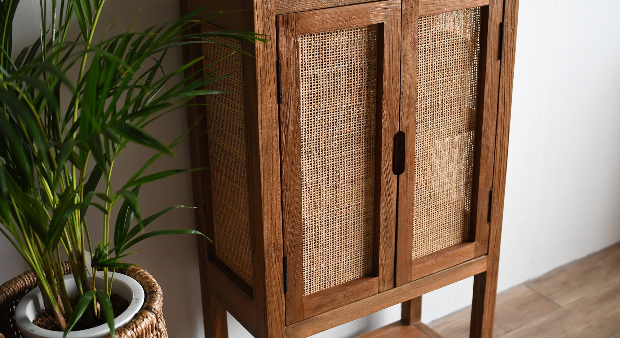 同シリーズのローボードなどと組み合わせれば、ラタンとチーク素材のもつ優しさとあたたかみのある雰囲気が増して、部屋全体がより美しくまとまります。