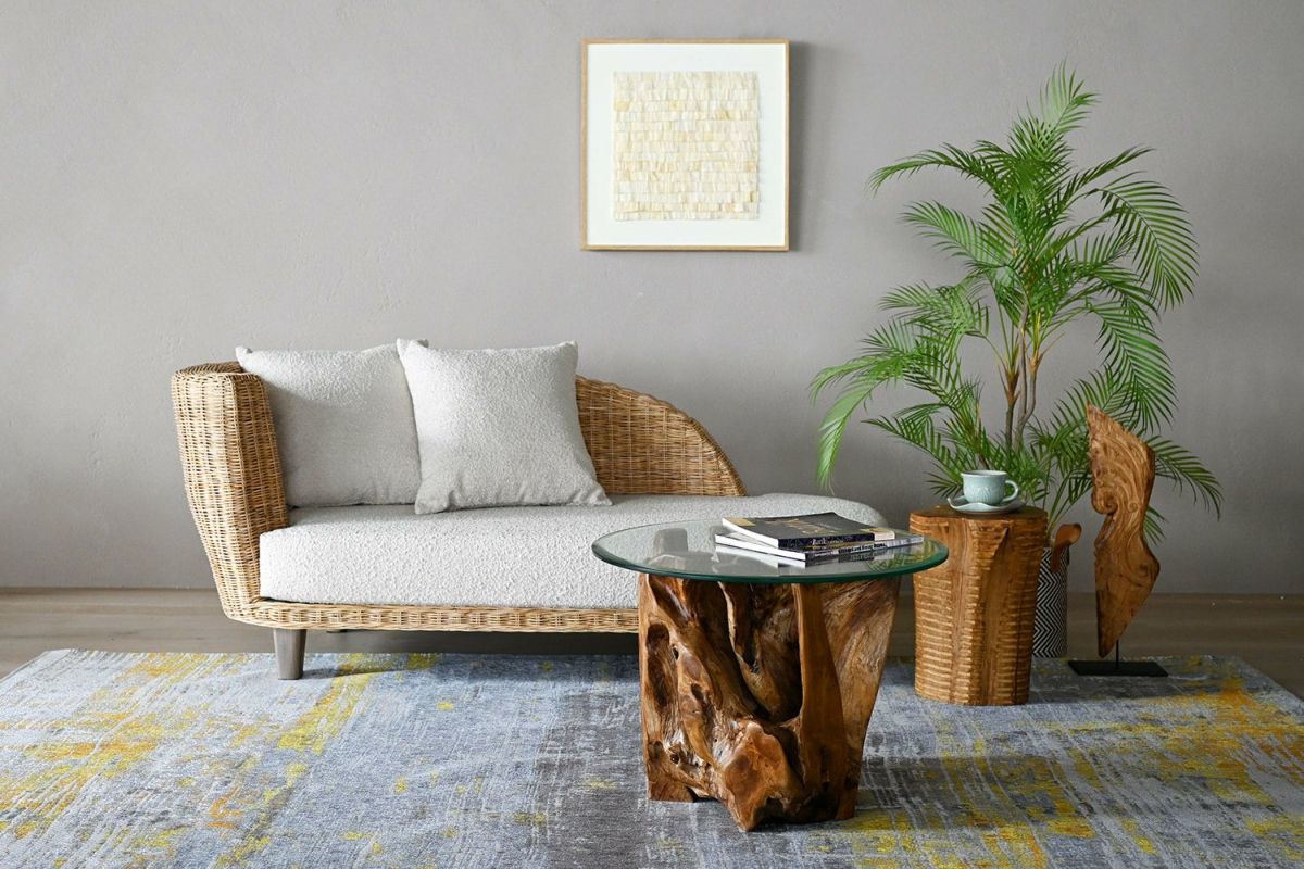 古民家をリフォームした何とも素敵なお宅に、ラタンの曲線と網目が美しいソファと素材感のある古木のローテーブルを中心に、リビングルームをコーディネート。 歴史を感じる梁や落ち着いた雰囲気の中ゆったりと座れるソファを選び、ゆっくりと時間を過ごせるようなリビングを目指しました。 古民家特有の梁を活かし古木独特の素材感やインドネシのレリーフ、グリーンを合わせることで素敵なコーディネートになりました。