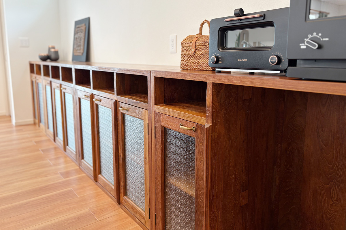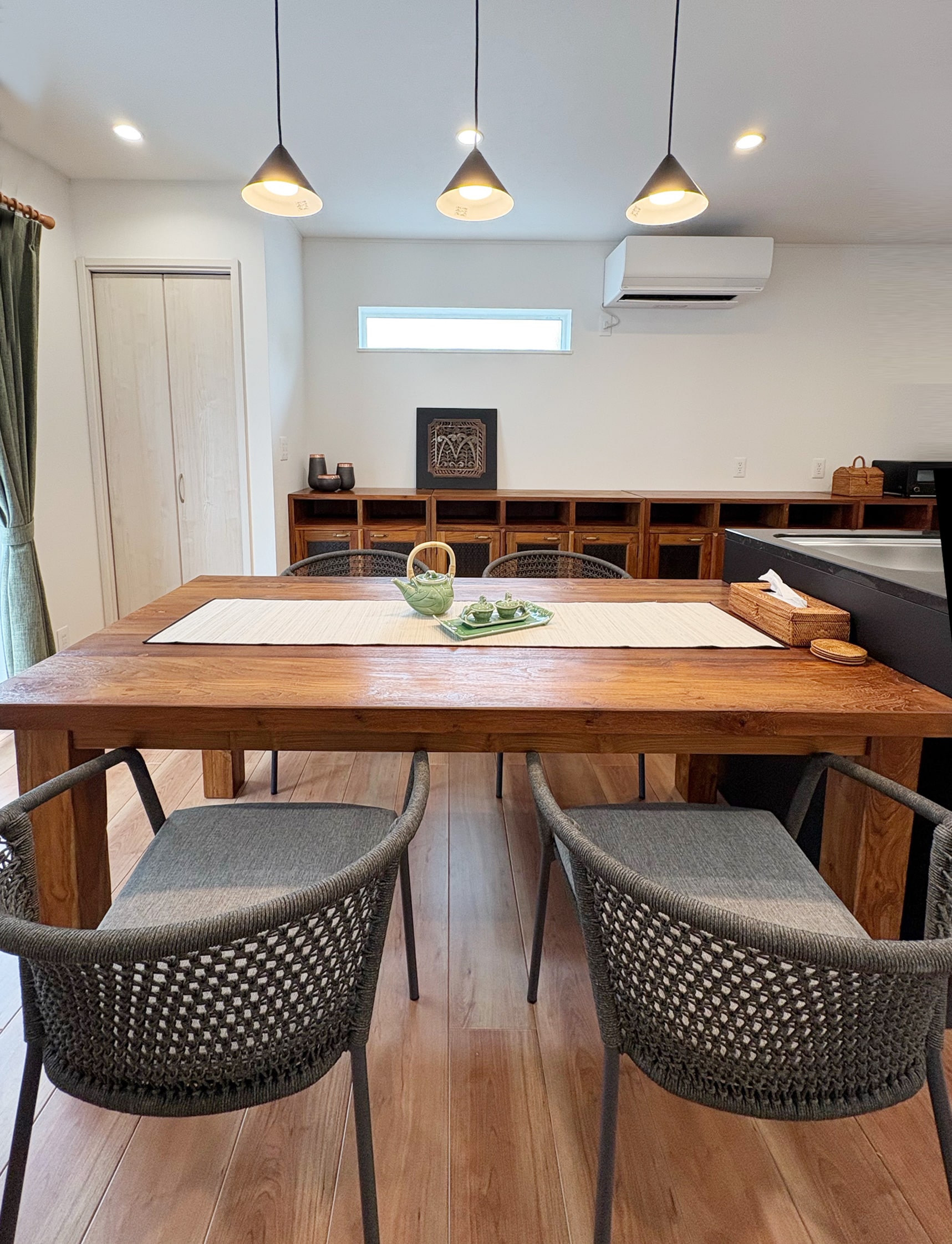 アクセントカラーのグリーンとチーク材の家具の相性が抜群な上、アイアンとキッチンのブラックが差し色になって、落ち着きのある上品な空間に仕上げています。壁一面にぴったりと配置したキッチンボードはオーダーで製作を行い、迫力満点の仕上がりとなりました。